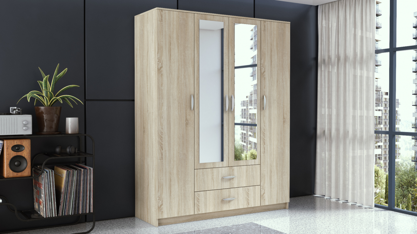 Designová skříň Romana si vás získá pro svou funkčnost a stabilitu. Skříň se díky svému designu a univerzální barvě bude hodit do většiny stylů interiéru. Skříň je vyrobená z PVC a dřevotřískové desky, jenž oceníte pro jeho odolnost a snadnou údržbu. Úložný prostor je prakticky rozdělen na dvě boční skříně s věšáky na zavěšení oblečení a dvě zásuvky. Šikovné členění napomůže k lepší organizaci a snadnému úklidu.